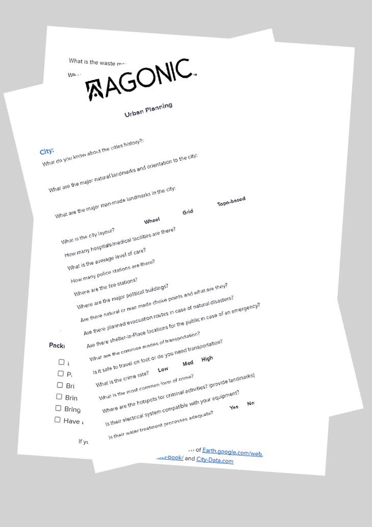 A free worksheet with resources to help you plan for trips to urban areas CONUS and OCONUS.